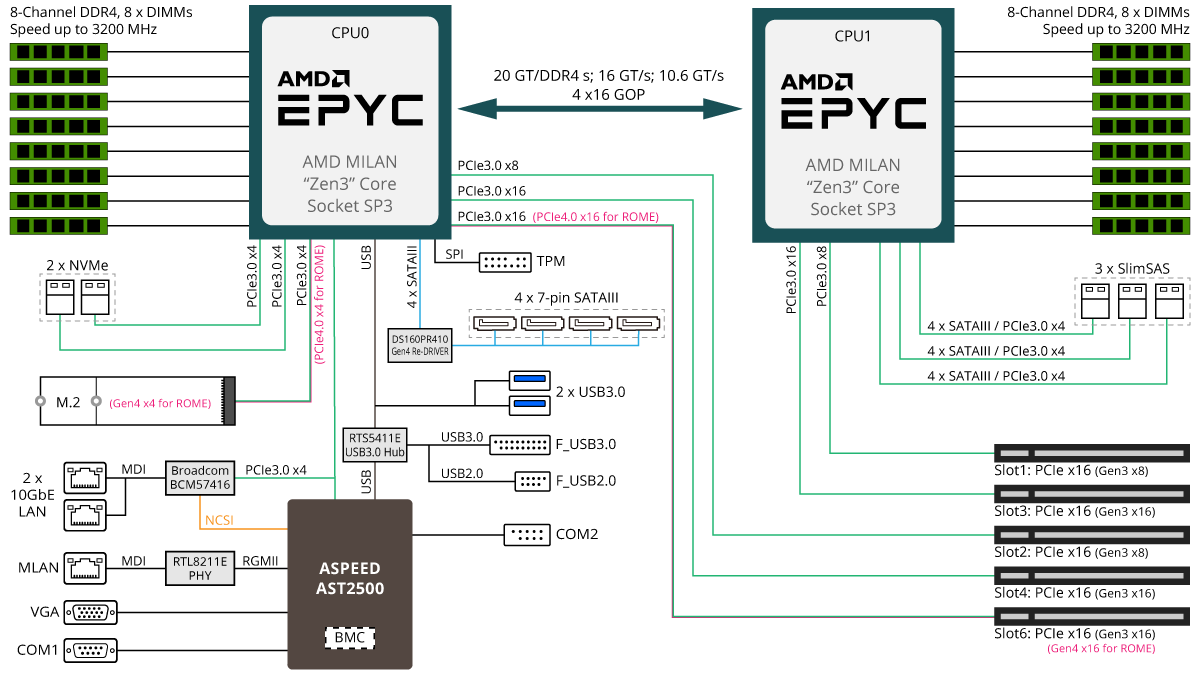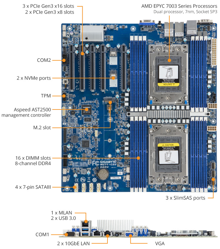 - 2 x SlimSAS (with 2 x NVMe PCIe Gen3 x4) ports