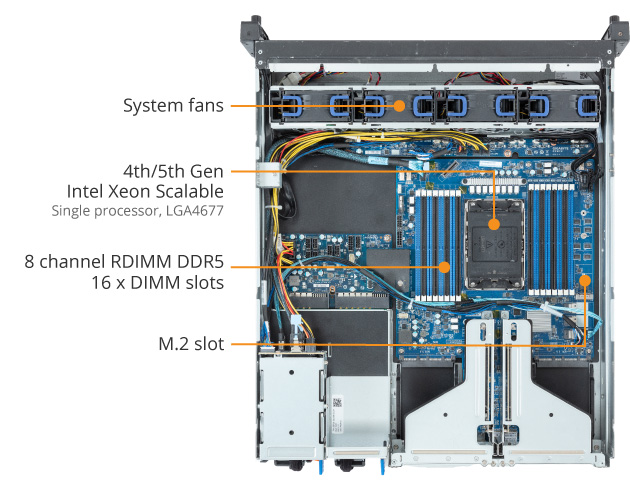 - 8-Channel RDIMM DDR5 per processor, 16 x DIMMs