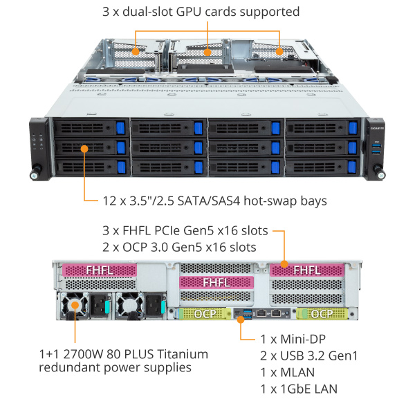 - 3 x FHFL PCIe Gen5 x16 slots for GPUs