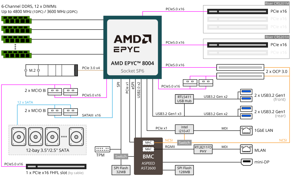 - 6-Channel RDIMM DDR5, 12 x DIMMs