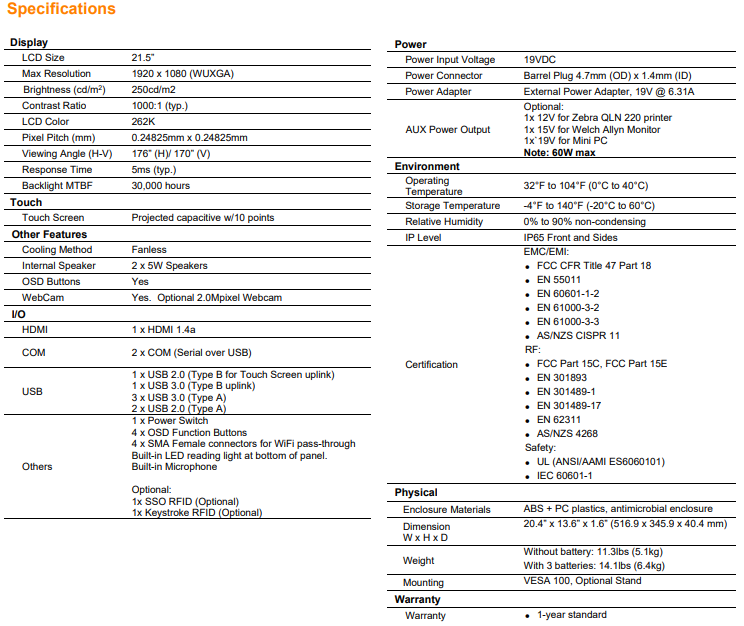 IP65 Rated, Optional Anti-Glare Film. Touchscreen, OSD Function Buttons, VESA Mount, Built-in Reading Light, Optional SSO or Keystroke RFID